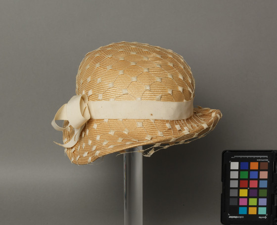 Baku straw, silk grosgrain ribbon, cotton net