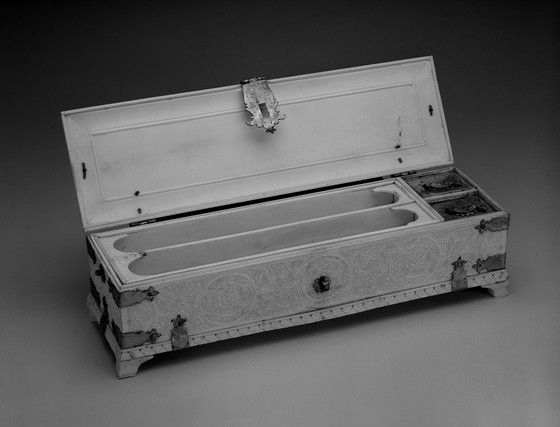 a) Pen Box: 2 1/2 x 9 1/2 x 3 in. (6.35 x 24.13 x 7.62 cm); b) Ivory Tray: 2 3/8 x 7 3/8 x 3/4 in. (6.03 x 18.73 x 1.91 cm); c) Silver and Brass Ink Well: 1 5/8 x 1 1/2 x 1 1/4 in. (4.13 x 3.81 x 3.18 cm); d) Silver and Brass Ink Well: 1 5/8 x 1 1/2 x 1 1/4 in. (4.13 x 3.81 x 3.18 cm)