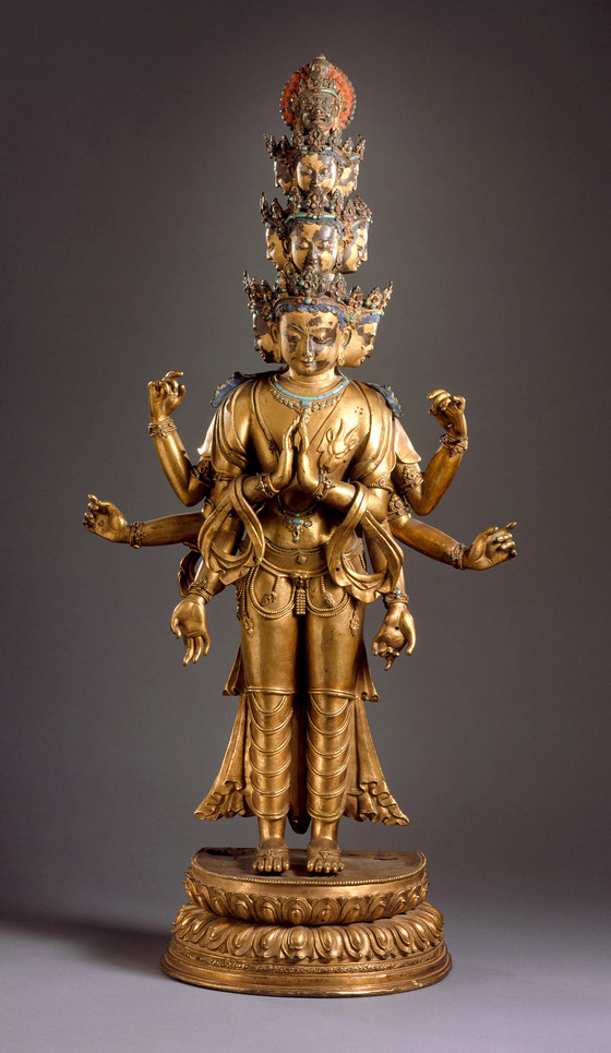 Gilt brass inlaid with turquoise and other gemstones; cold gold paste and paint