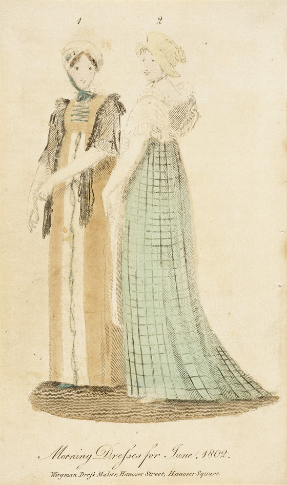 Fashion Plate, 'Morning Dresses for June, 1802' for 'Lady's Monthly Magazine'