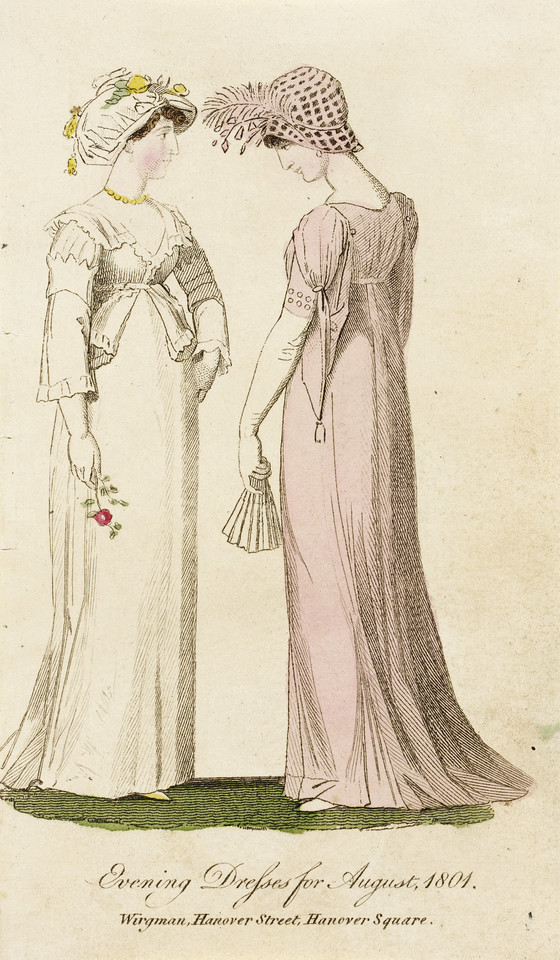 Fashion Plate, 'Evening Dresses for August, 1801' for 'Lady's Monthly Magazine'
