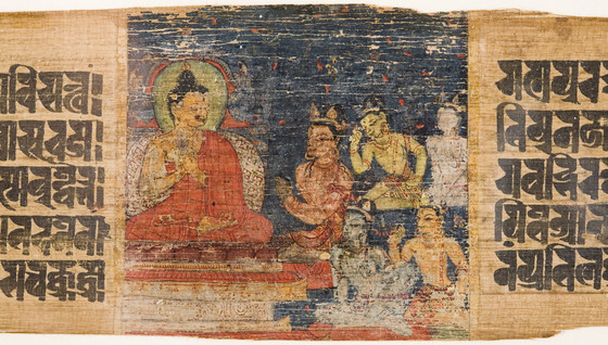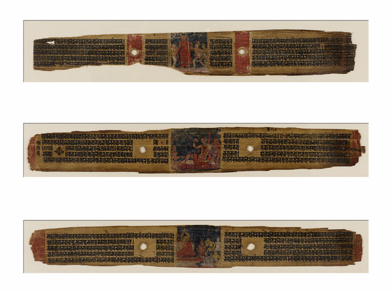 The Buddha's Descent from Heaven at Samkashya (top; a), The Story of the Bodhisattva Sadaprarudita (middle; b), The Buddha Preaching to the Assembled Gods (bottom; c), Three Folios from a Prajnaparamita (The Perfection of Wisdom)?