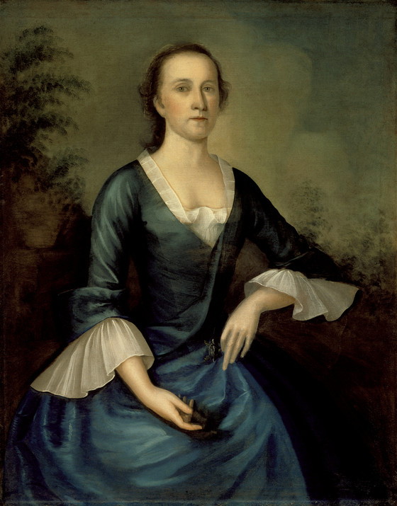 An unusual feature of the portrait of Sarah Larrabee Edes is the evidence of significant changes in design, particularly in the position of the hands. Her proper right hand originally was painted as extending further into the lap, and her proper left hand, with its linen sleeve hanging downward, was raised toward her bosom, as though tucking a flower into the neckline, as in Robert Feke’s Mrs. James Bowdoin II, 1748 (Bowdoin College Museum of Art, Brunswick, Maine).
