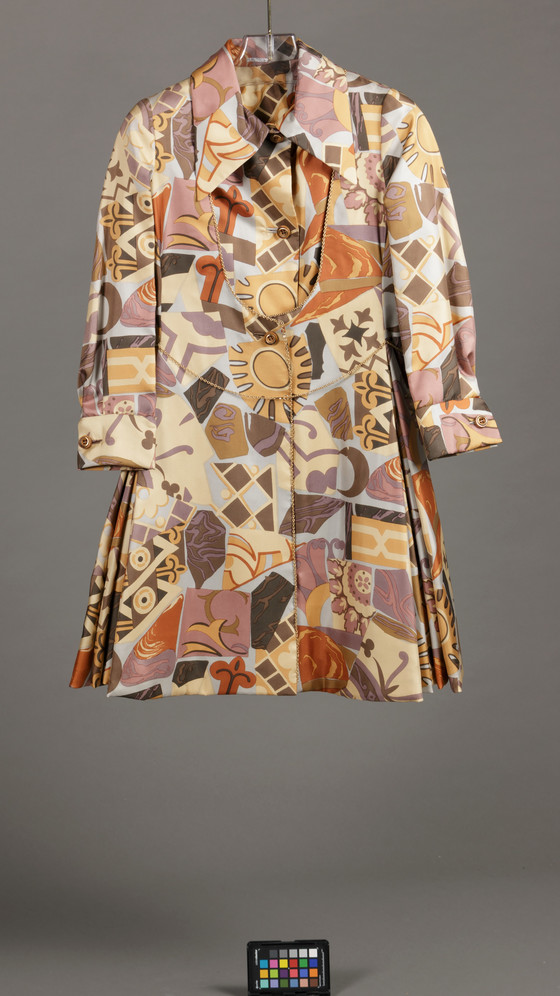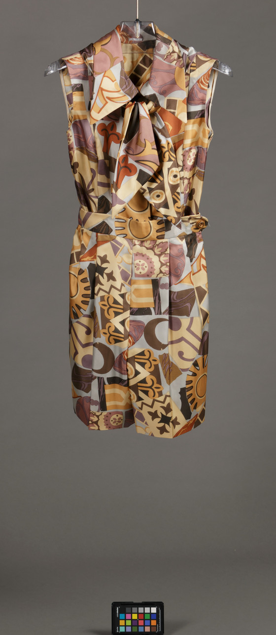 Dress: Silk twill, printed, metal chain; Blouse, Shorts, Sash: Silk twill, printed