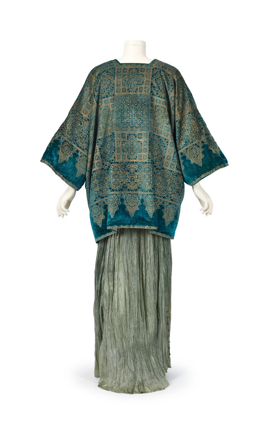 a) Dress: Silk twill, pleated, with silk cord and glass beads