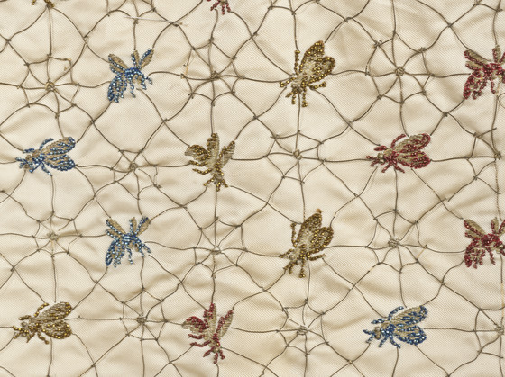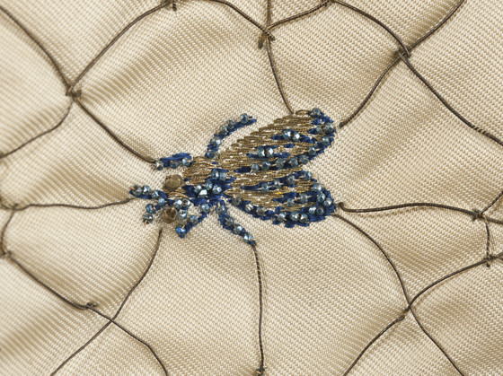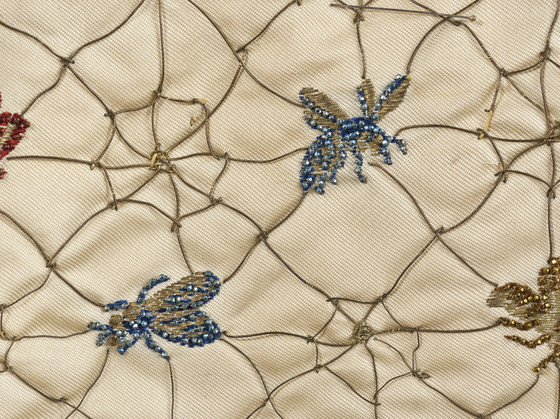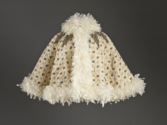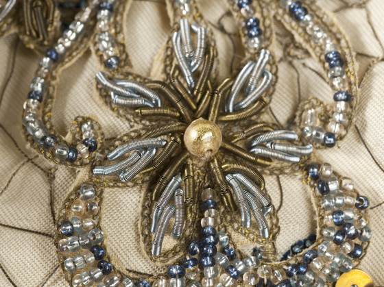 Silk twill with metallic-thread supplementary weft patterning, glass beads, metal beads, metal sequins, metallic-thread embroidery, and feathers