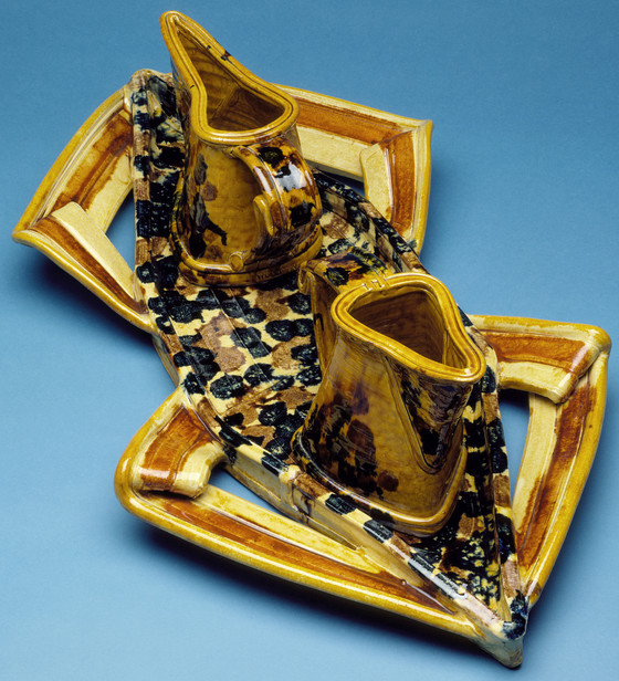 a-b) Pitchers: 7 1/2 x 10 x 4 1/4 in. (19.05 x 25.4 x 10.8 cm) each; c) Tray: 2 1/2 x 31 1/2 x 16 1/4 in. (6.35 x 80.01 x 41.28 cm)