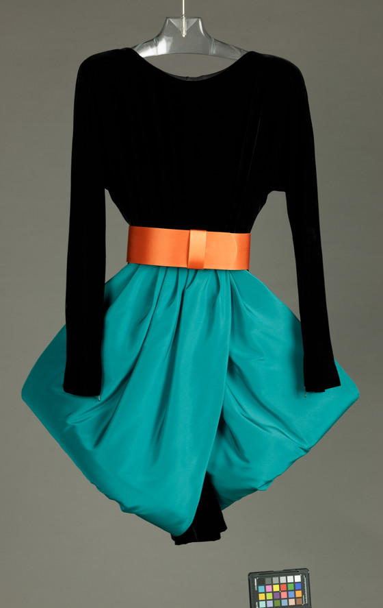 Dress: rayon velvet, silk faille. Belt: silk satin