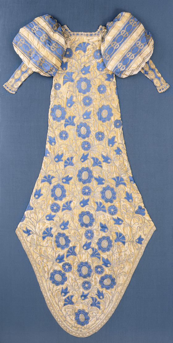 a) Gown center back length: 88 1/2 in. (224.79 cm); b-c) Sleeves: 21 1/2 x 16 in. (54.61 x 40.64 cm)