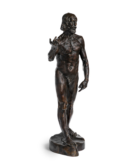 B. Gerald Cantor's single gesture in 1973 offered a coherent overview of Rodin's career, from the early Saint John the Baptist Preaching (1878; cast 1966) to the late (c. 1900–1910) enlarged adaptations of pre-existing compositions like The Prodigal Son, The Large Crouching Woman, and The Earth, all originally conceived about twenty years earlier for the Gates of Hell. Individual figures, such as Jean d’Aire and Jean de Fiennes , created for the Burghers of Calais (1889), and compositions related to the Monument to Victor Hugo (1890) were included, as were portraits, recombined fragments, and independent subjects. The most dramatic single sculpture was certainly the ninth cast of the colossal Monument to Balzac, which is prominently installed in front of the museum. These were cast posthumously as authorized by Rodin's will.