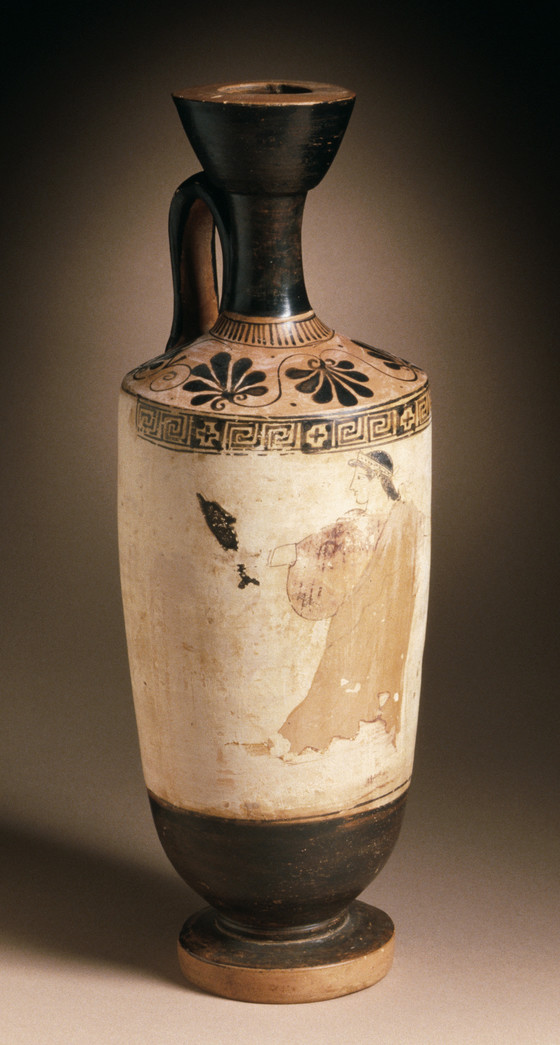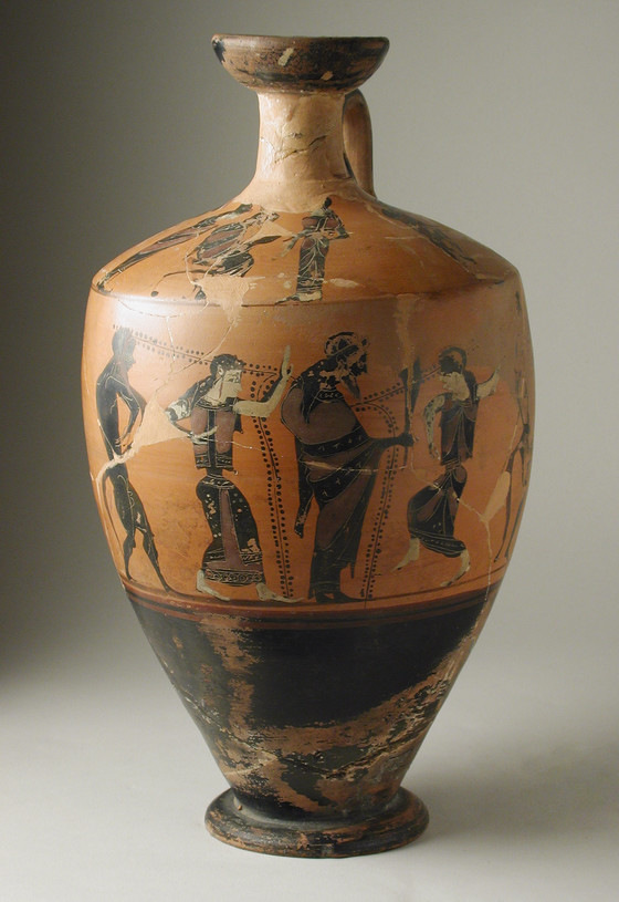 Attic Black-Figure Lekythos with (Body) Dionysos between Maenads and Satyrs and (Shoulder) a Seated Man between Women and Men