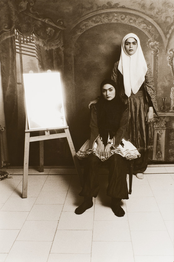 These photographs are from a series of thirty-three portraits by Shadi Ghadirian, a contemporary artist who was inspired by the studio portraiture first introduced to Iran in the late nineteenth century under the Qajar dynasty (1794–1925). In order to re-create the earlier setting, Ghadirian employs painted backdrops and dresses her models in vintage clothes to emulate the fashion of the day: headscarves and short skirts worn over baggy trousers, as well as thick, black eyebrows. She adds modern elements to these traditional scenes, such as a Pepsi can, a boom box, a bicycle and an avant-garde Tehran newspaper. She has said of her work, "My pictures became a mirror reflecting how I felt: we are stuck between tradition and modernity."