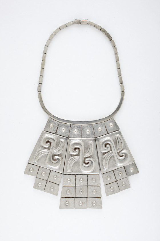 In the twentieth century the Mexican silver industry experienced an unprecedented resurgence. Two North Americans catalyzed this renaissance. In the mid-1920s, Frederick Davis opened a gallery in Mexico City and developed a line of handwrought silver jewelry. William Spratling, an architect from New Orleans, established a workshop in Taxco in 1931 where he worked alongside a local master silversmith and a handful of young men. A brilliant marketing strategist Spratling reinvigorated Taxco’s economy by employing hundreds of local artisans and creating a thriving local industry. Other designers–several represented in LACMA’s collection–followed and established equally successful workshops.