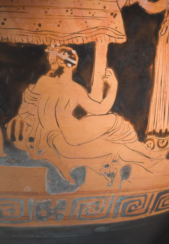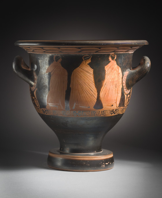 Attic Red-Figure Bell-Krater with (A) Unexplained Scene (Two Satyrs Reclining before a Colossal Couch) and (B) Three Youths