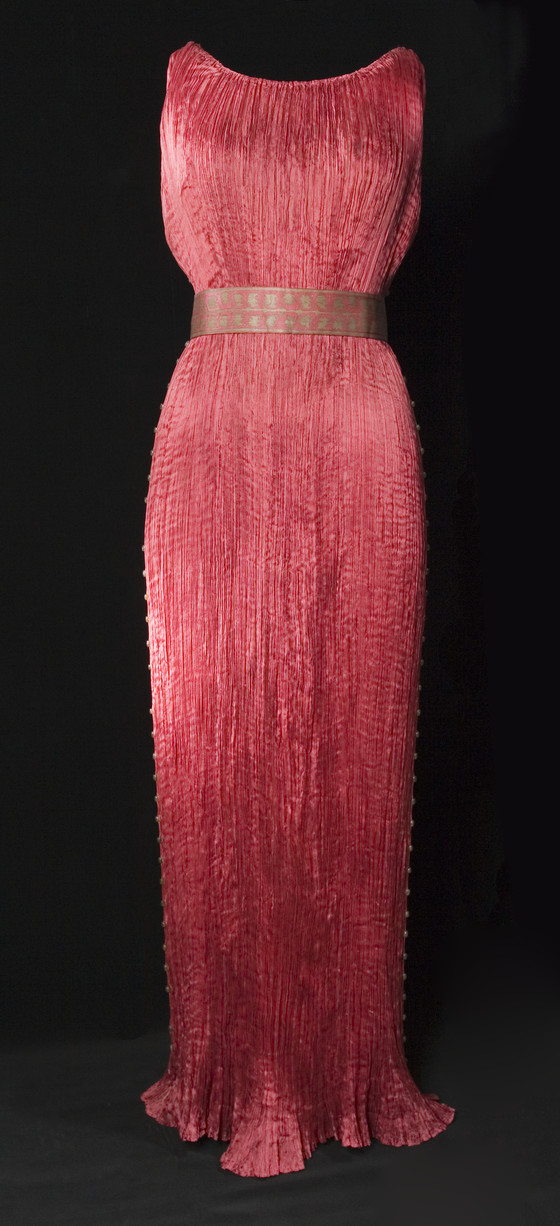 Dress: Silk plain weave, pleated, with silk cord and glass beads. Belt: Silk plain weave, printed.