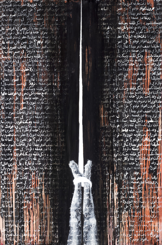 Upside Down belongs to Alkadhi’s 2008 series entitled "Hanging," in which the compositions, filled with calligraphy, depict figures hanging in mid-air that serve as visual metaphors for the uncertainty of everyday life in Iraq. There is little or no color in these powerful, macabre and uncomfortable images. As in much of his work, the artist juxtaposes strong draftsmanship, in the western sense, with his mastery of Arabic calligraphy, which makes for both dramatic fusion and visual tension. The words are not mere decoration but merge with and amplify his emotionally charged image of a pair of legs belonging to someone hung upside down. The text, by the 10th-century Iraqi-born poet Abu Firas al-Hamdani, was composed while the poet was imprisoned in Constantinople and much later was set to music and popularized in the mid-20th century. The verses, which are well-known even today, are written as if spoken by the prisoner to a dove that has landed near his window. They begin "O neighbor, if you could only feel what I feel…you who have yet to taste pain."