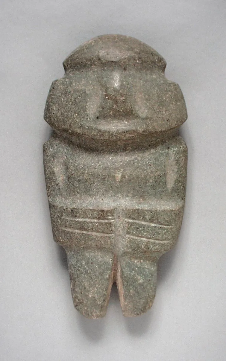 Small stone sculpture of a standing human figure, carved from coarse gray stone with incised lines indicating facial features and body divisions
