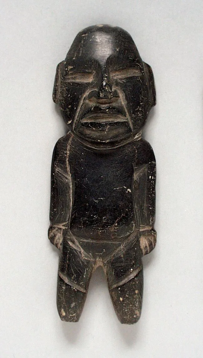 Small carved figurine of a standing human form in dark black stone or wood, with incised facial features and blocky, simplified limbs