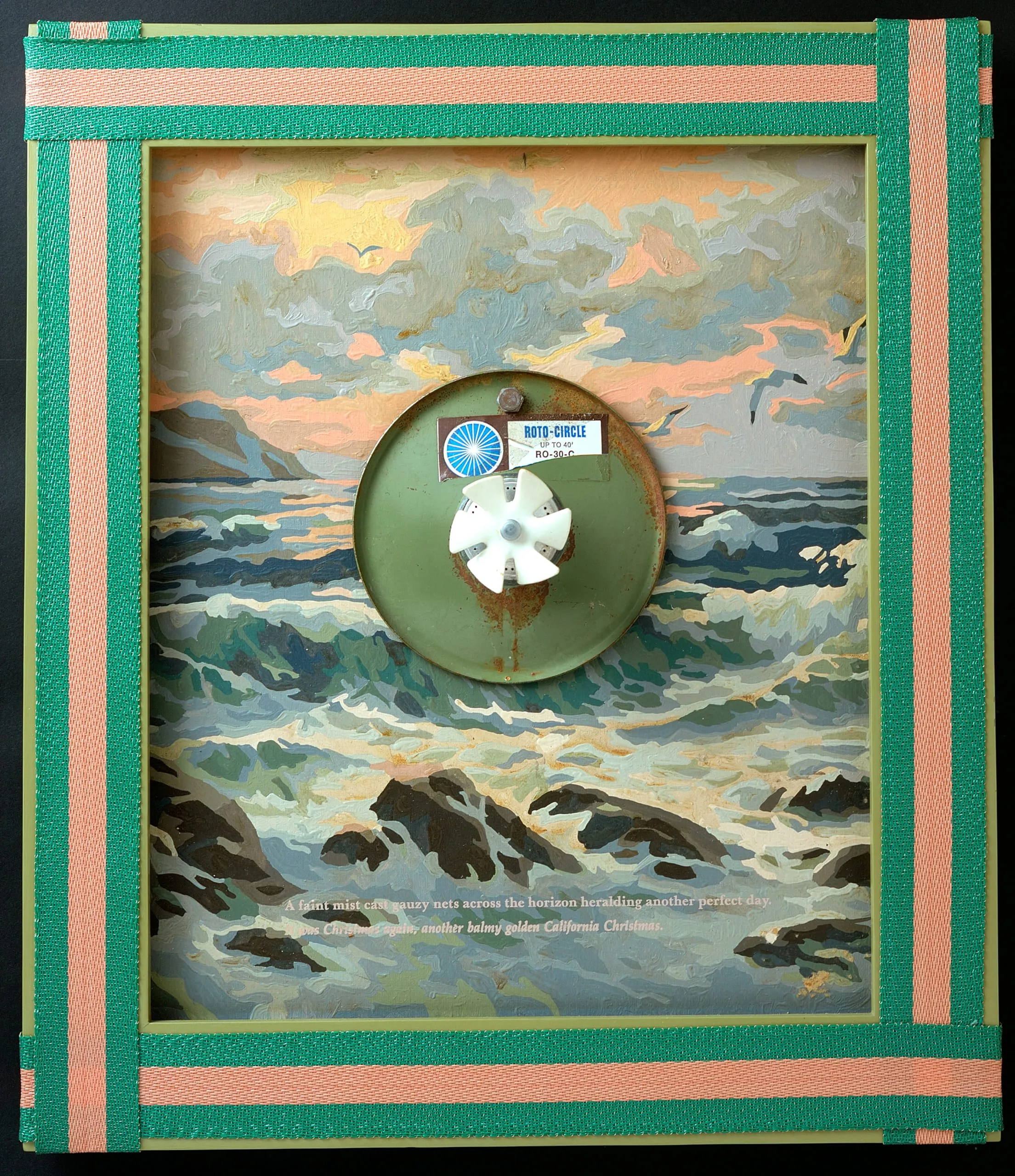 - Oil on board, vinyl strapping, sprinkler head, sticker, and wood frame