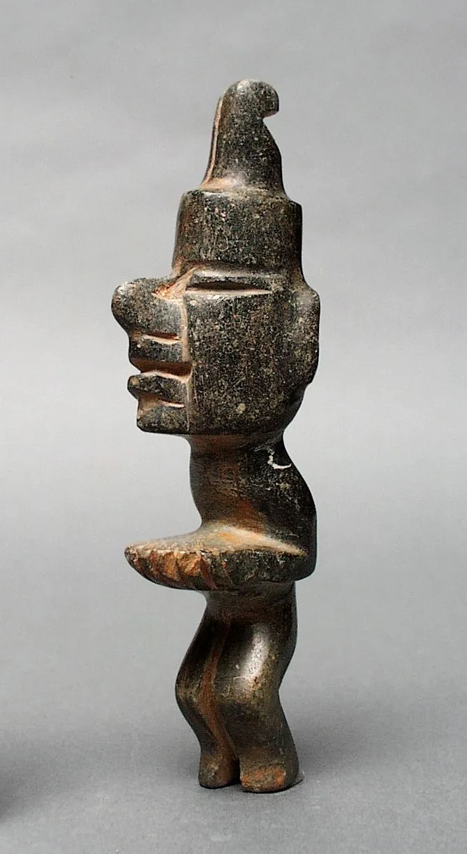 Small carved stone figurine in profile, depicting a stylized standing figure with a stepped tiered headdress and angular facial ridges, dark surface with reddish-brown grooves