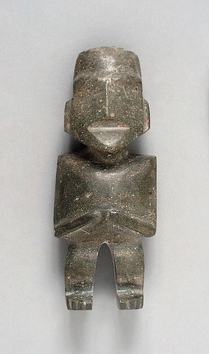 Small carved stone figurine of a standing human form with a flat rectangular head, crossed arms, and simplified facial features, in dark gray-green stone