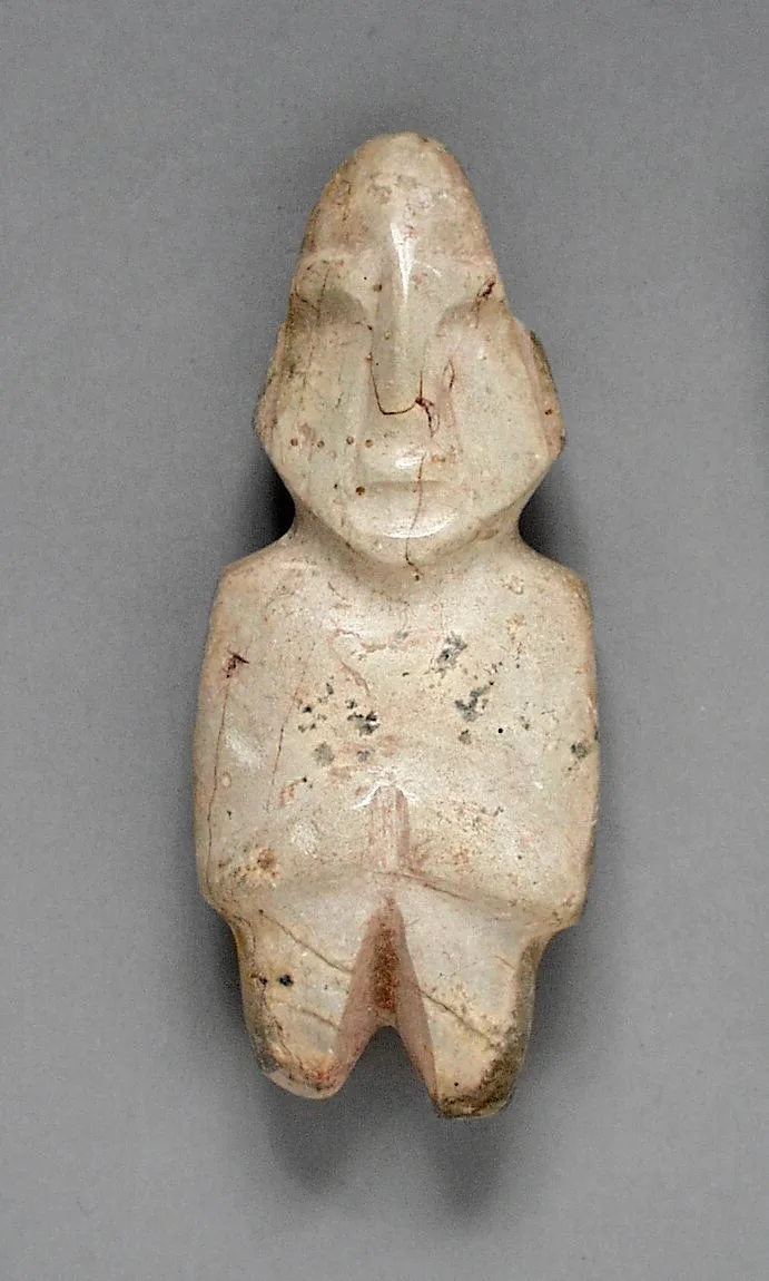 Small carved stone figurine of an abstracted human form with a pointed head, minimal facial features, and arms folded across the chest, cream-white with pinkish and dark spots