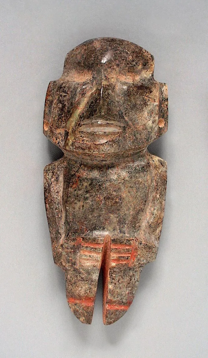 Small carved stone figure with stylized human form, mottled gray-brown surface with traces of coral-red pigment in incised grooves at the midsection