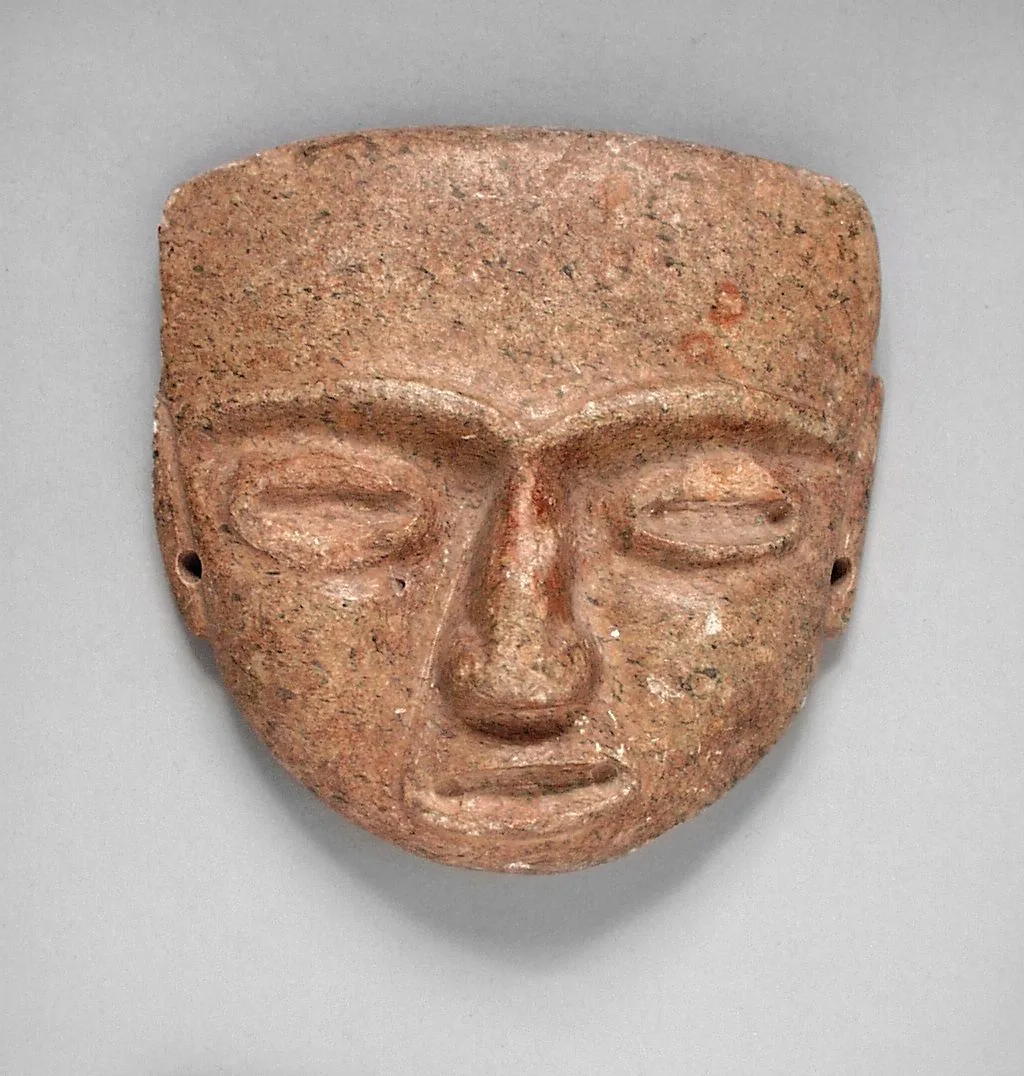 Stone mask with salmon-pink granular surface, carved facial features including almond-shaped eyes, broad nose, and closed mouth, with small attachment holes on each side