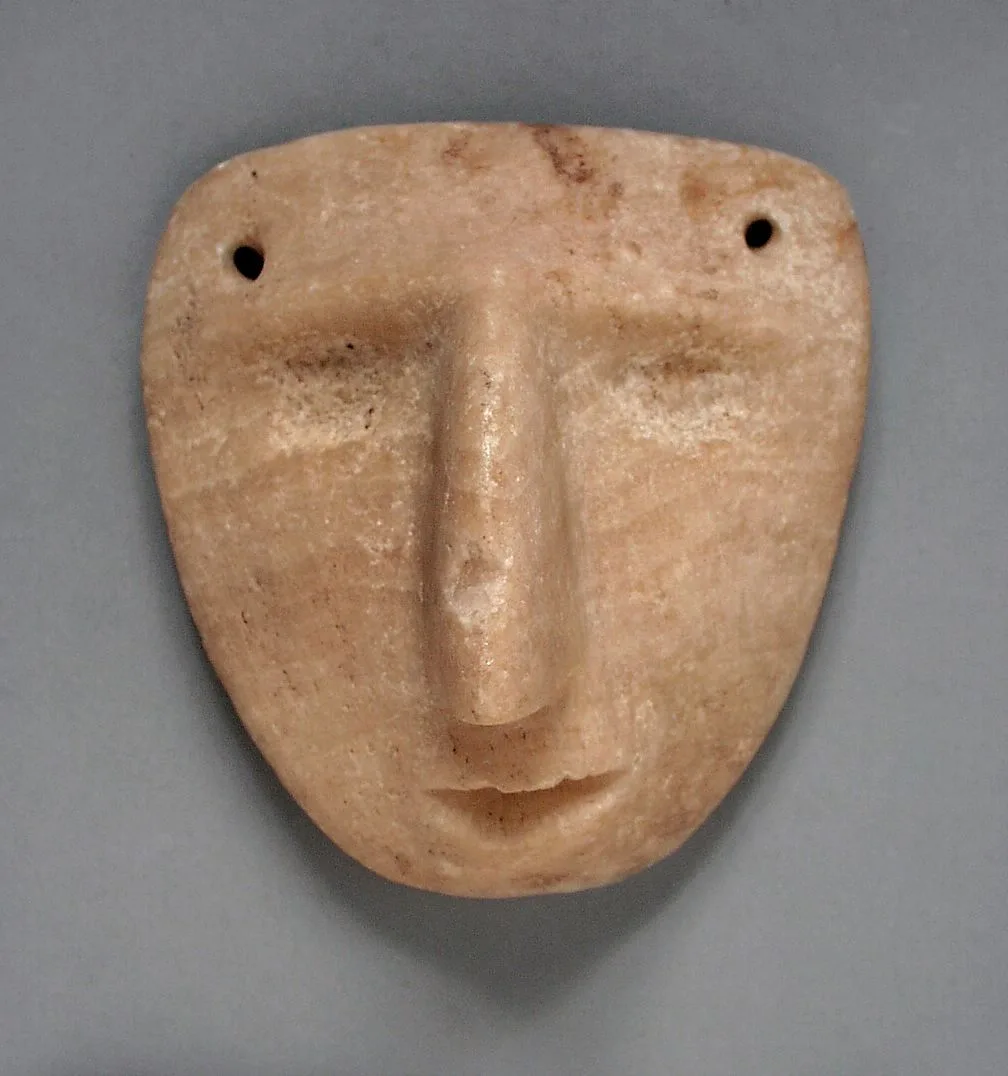 Small stone face plaque in pale peachy-tan with low-relief carved nose, brow ridges, and closed mouth, with two suspension holes near the upper corners