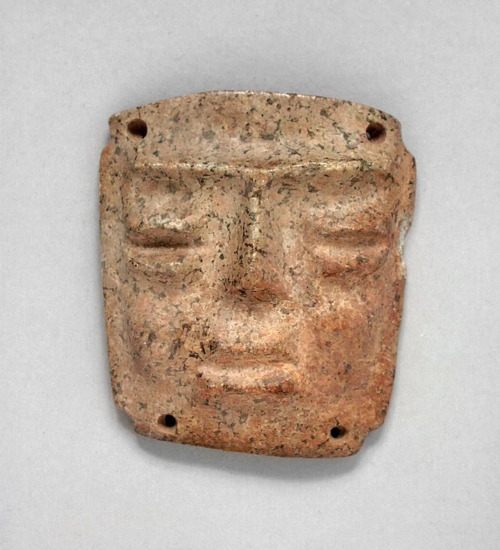 Small carved stone mask with low-relief facial features, salmon-pink and gray-green mottled surface, six attachment holes along the edges