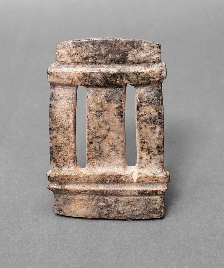 Small carved stone architectural model with four rounded columns, open slots between them, stepped rectangular base, and flat disc-shaped top