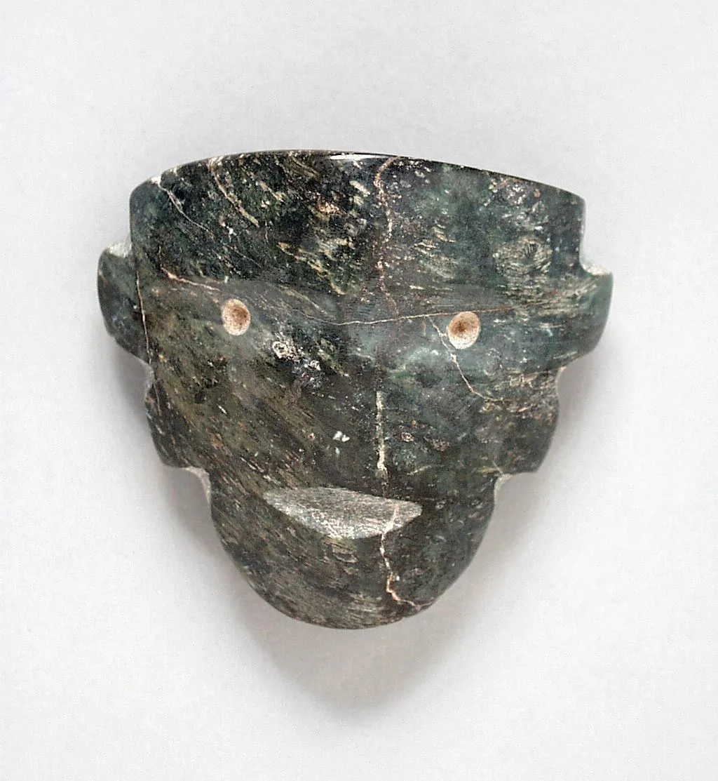 Small carved dark green stone mask or face with drilled circular eyes, open bowl top, and trapezoidal nose projection, with veined surface and visible wear