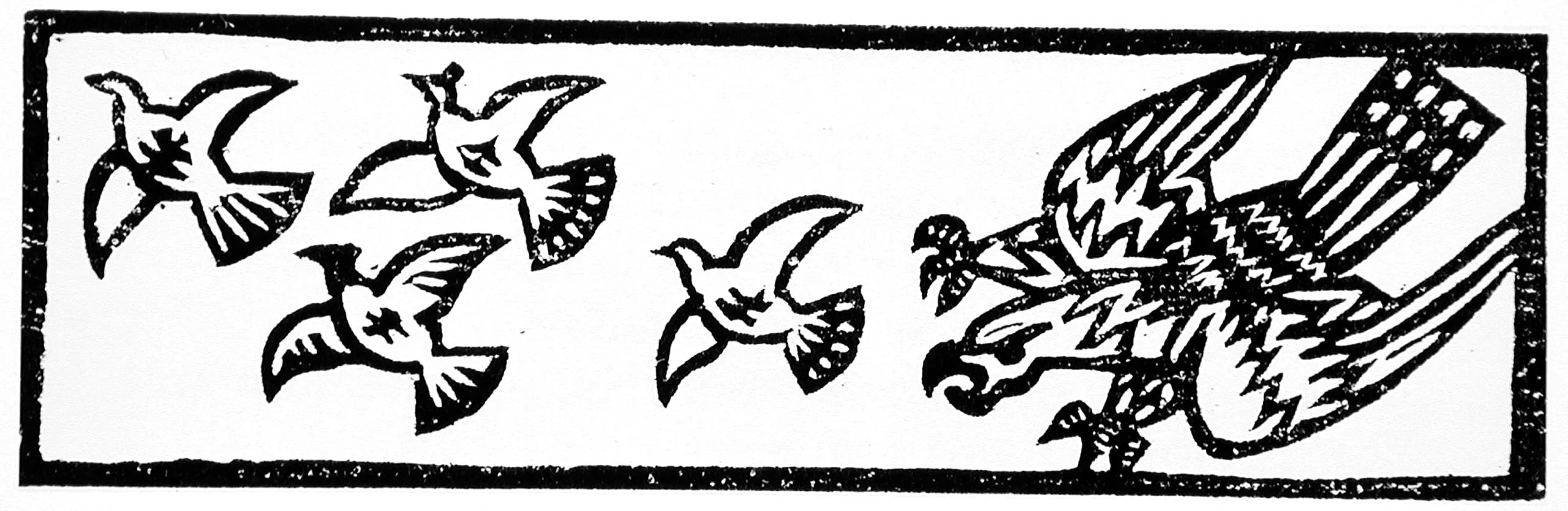Woodcut-style print of five small doves in flight to the left facing a large bird of prey with open beak and extended talons, bold black lines on cream paper