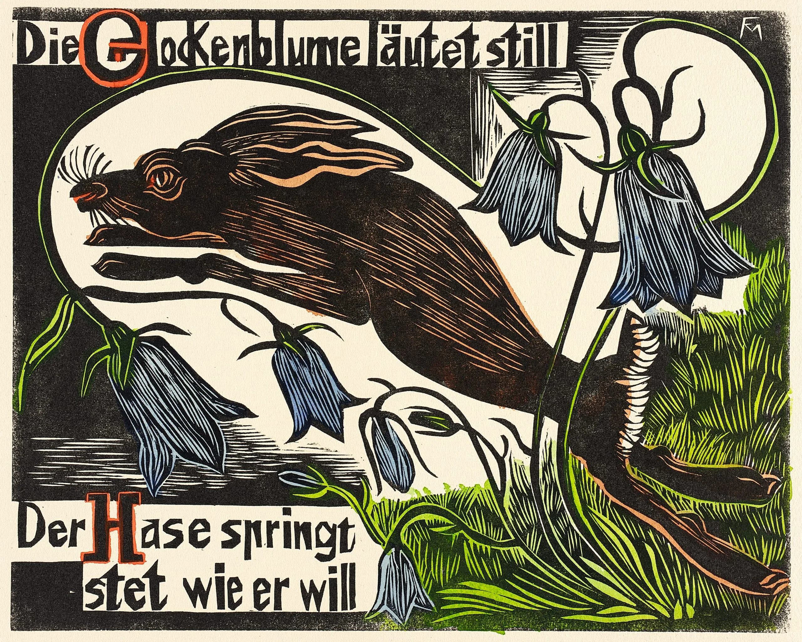 - Woodcut printed with blue, green, and orange watercolor on handmade paper