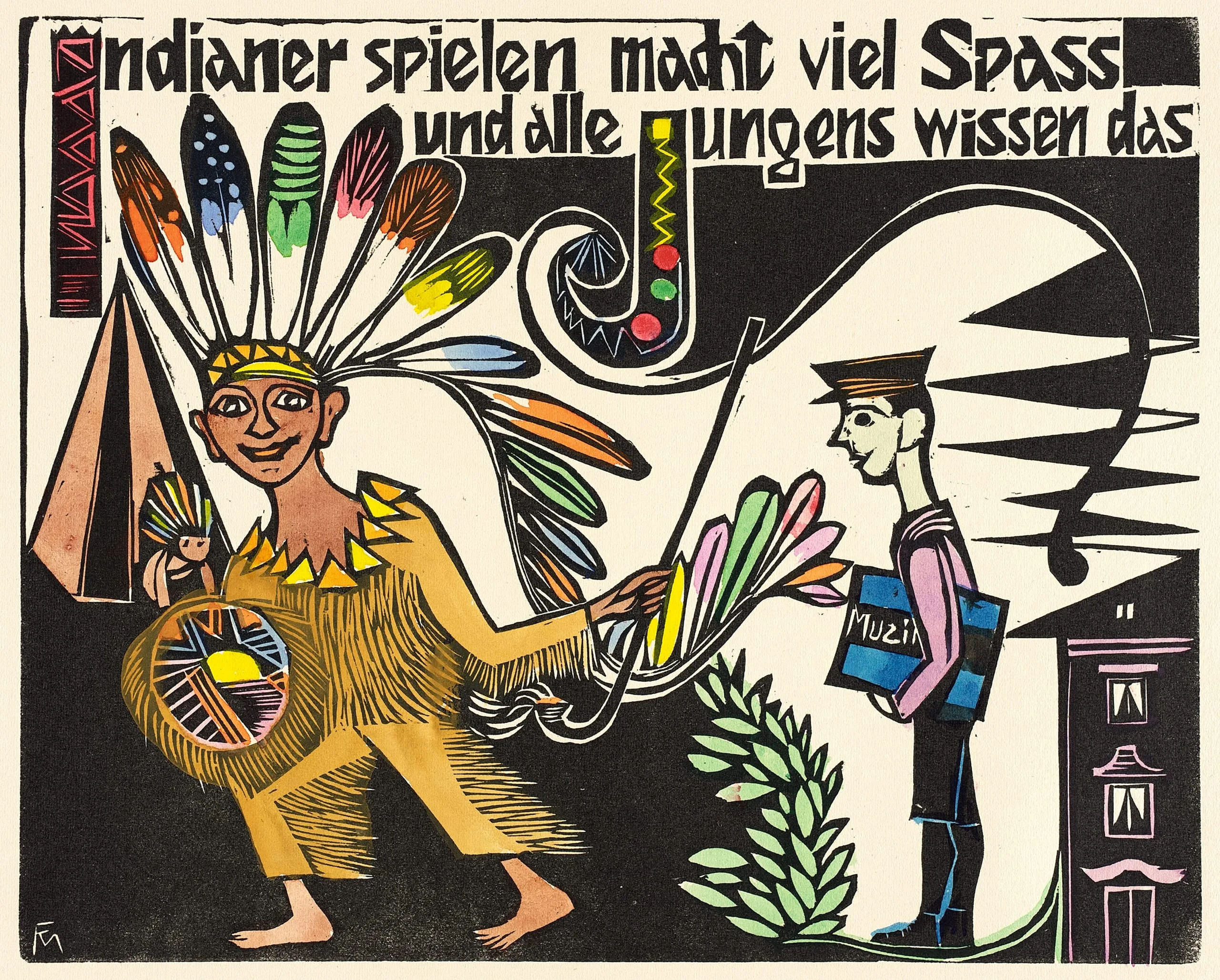 - Woodcut printed with yellow, red, green, orange, purple, blue, and ocher watercolor on handmade paper