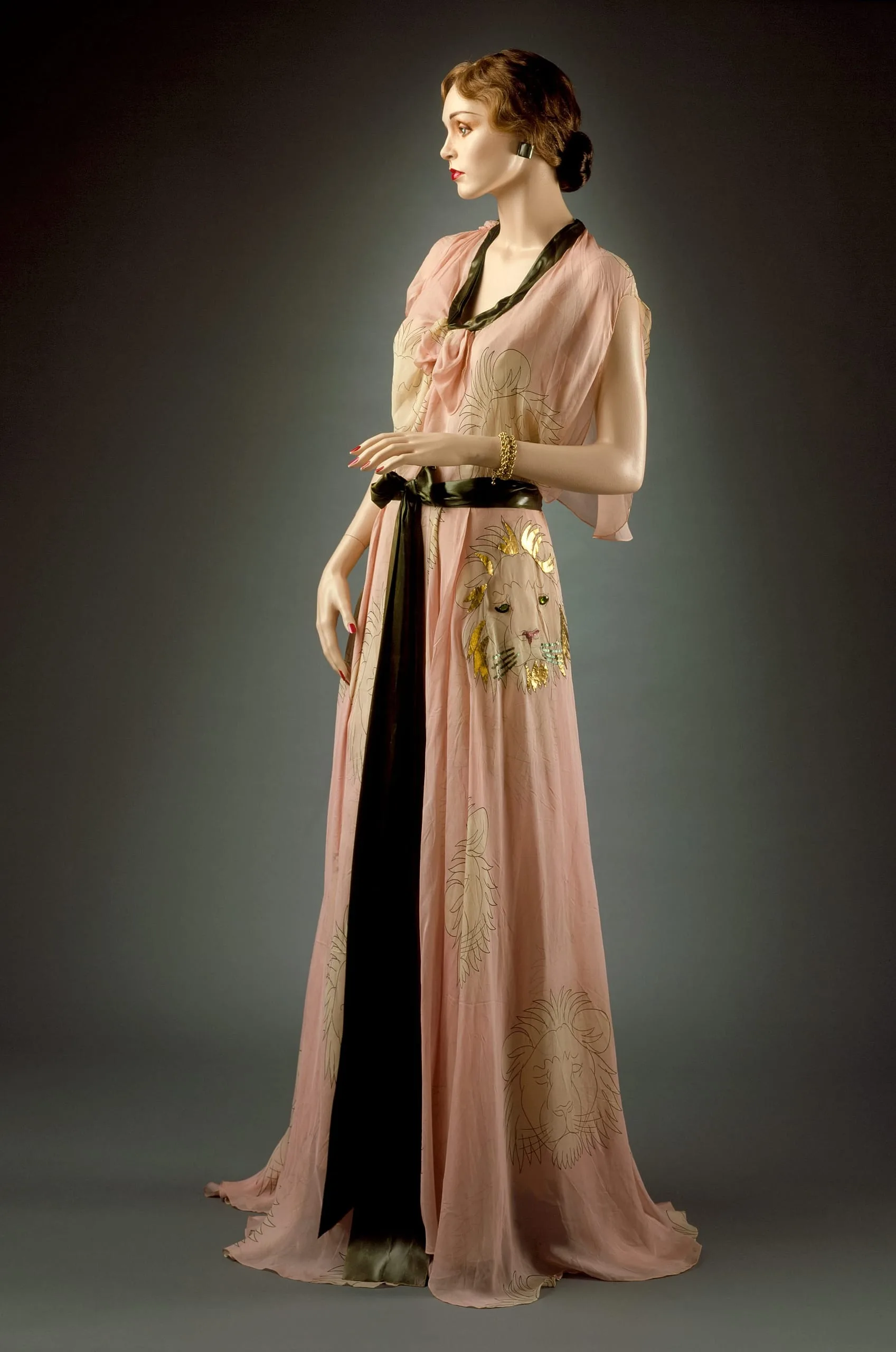 - Dress: silk plain weave (chiffon), printed, with crystals, sequins, and leather appliqué, and rayon satin ribbon; Slip: slik plain weave and silk plain weave (chiffon), printed; Belt: rayon satin ribbon