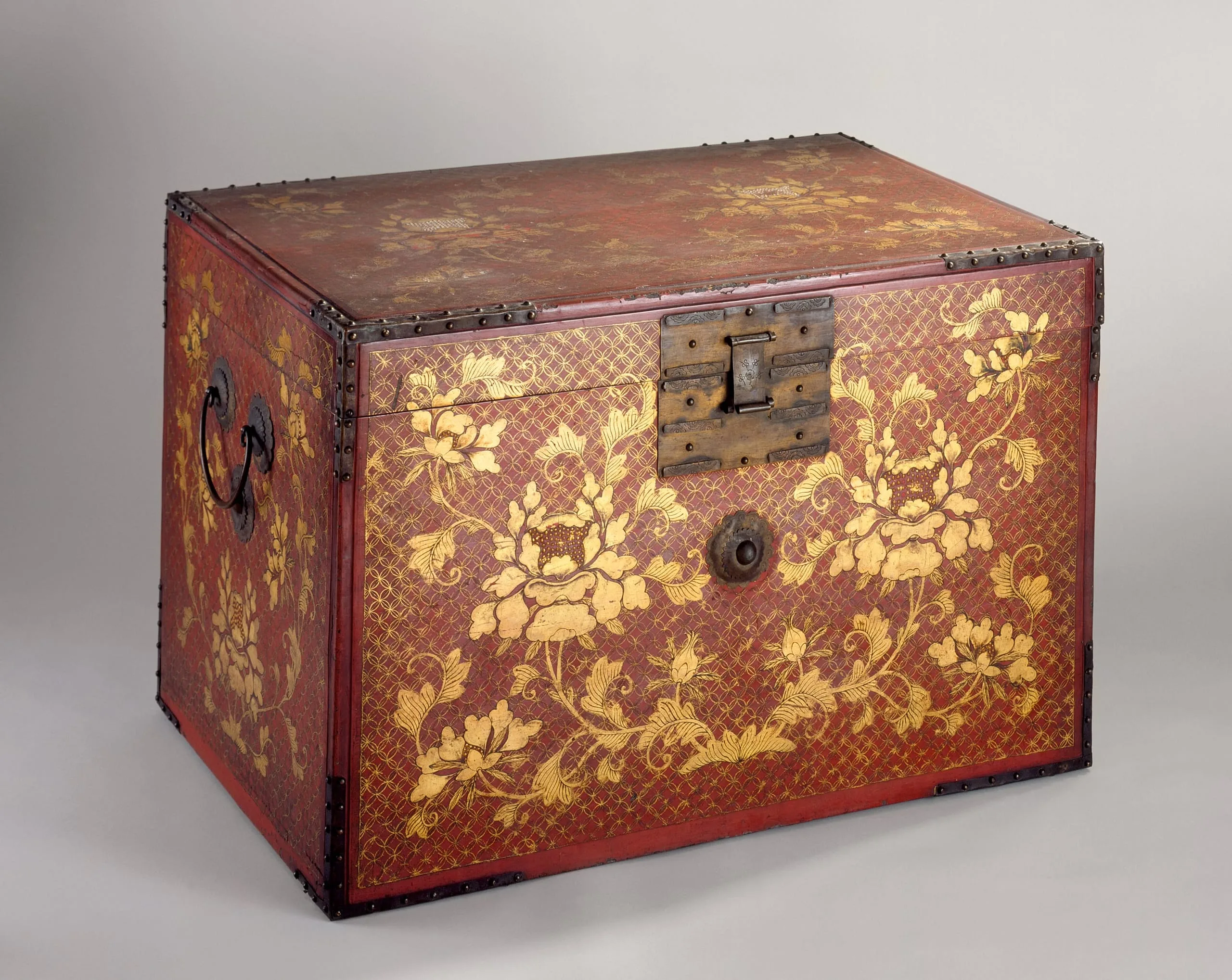 - Red lacquer on wood core with applied gold leaf (hakue in Japanese), and incised decoration (tsuikin in Japanese), and metal fittings