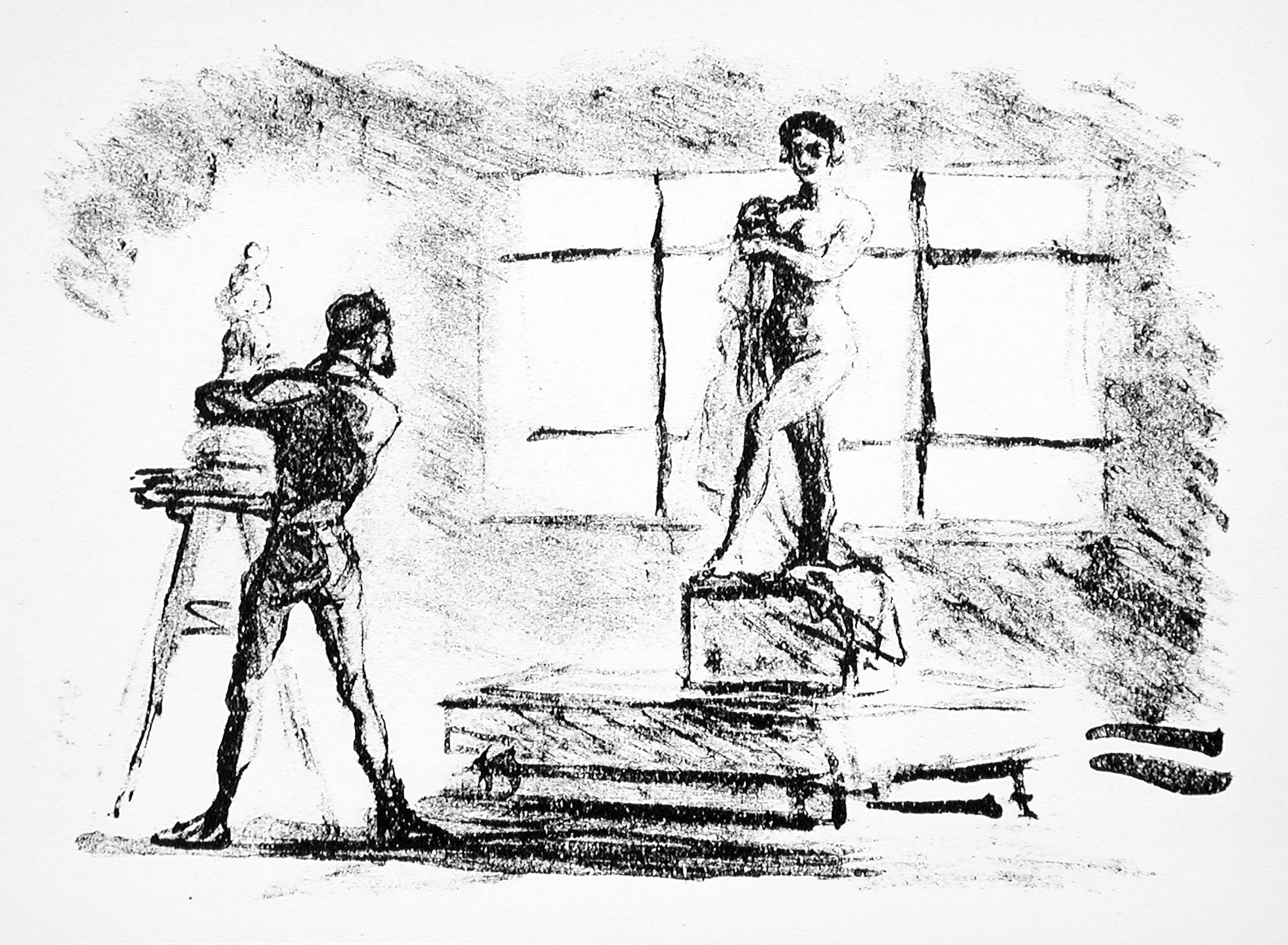 Lithograph with loose black marks showing two figures in an interior — one standing at a worktable on the left, another elevated on a plinth at center right