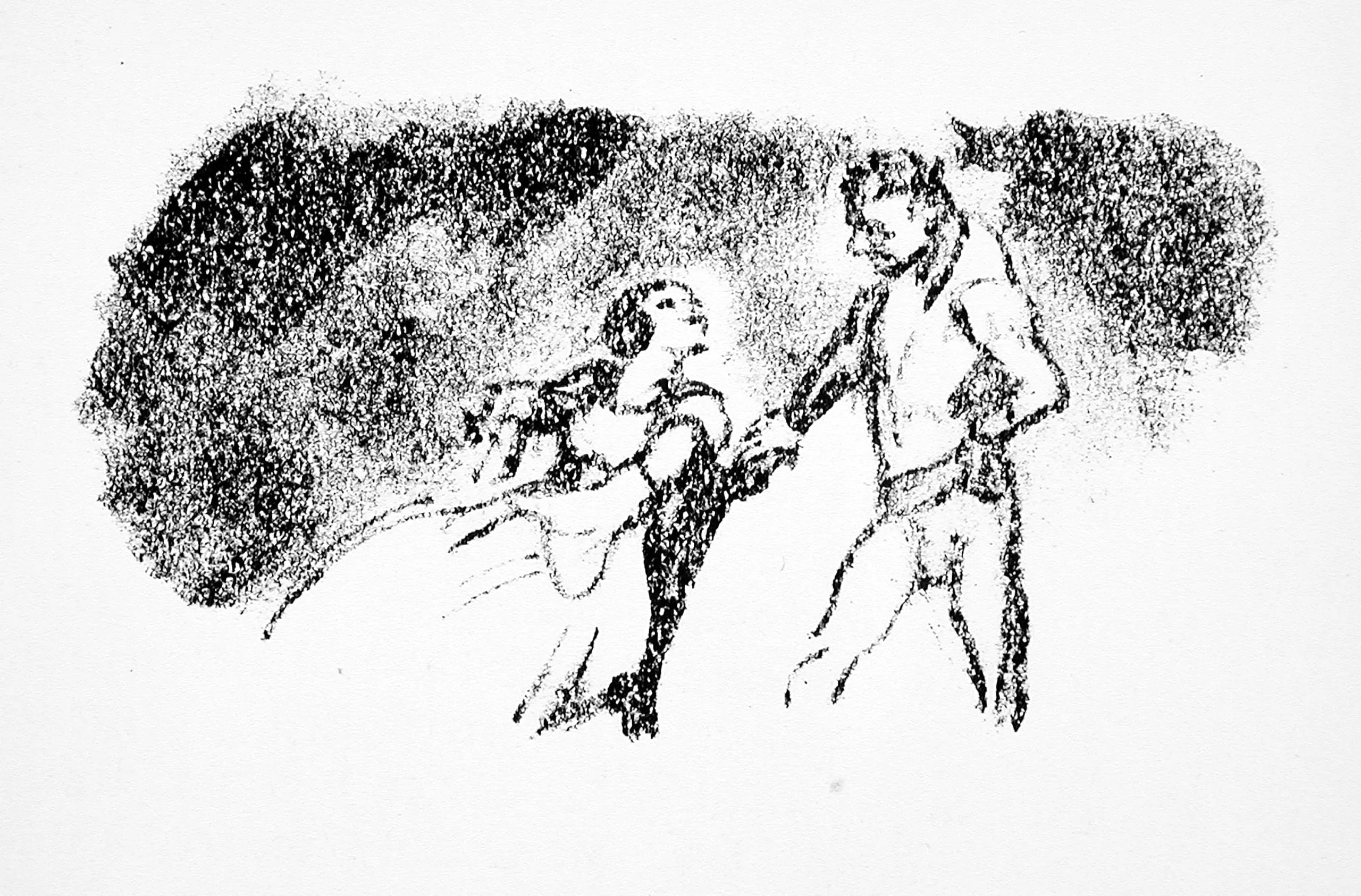 Lithograph of two figures — one crouching, one standing — rendered in loose chalky marks against a soft dark background on white paper