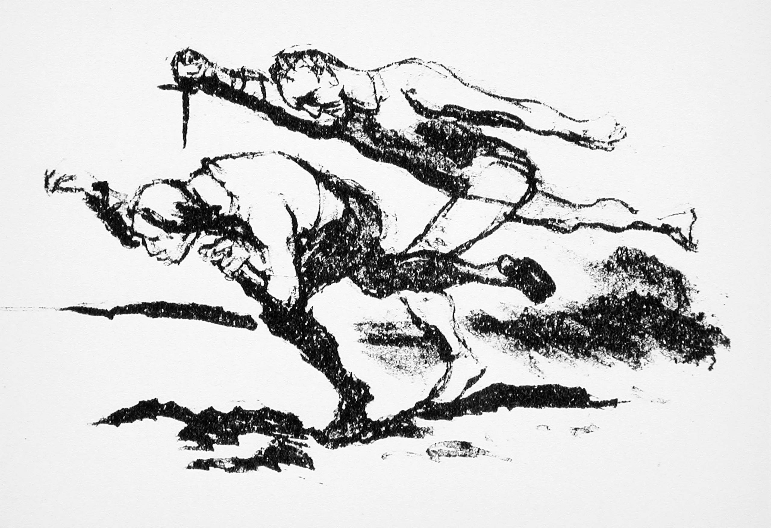Lithograph or similar print showing two figures lunging forward in near-horizontal postures, rendered in bold black ink with gestural brushwork on white paper