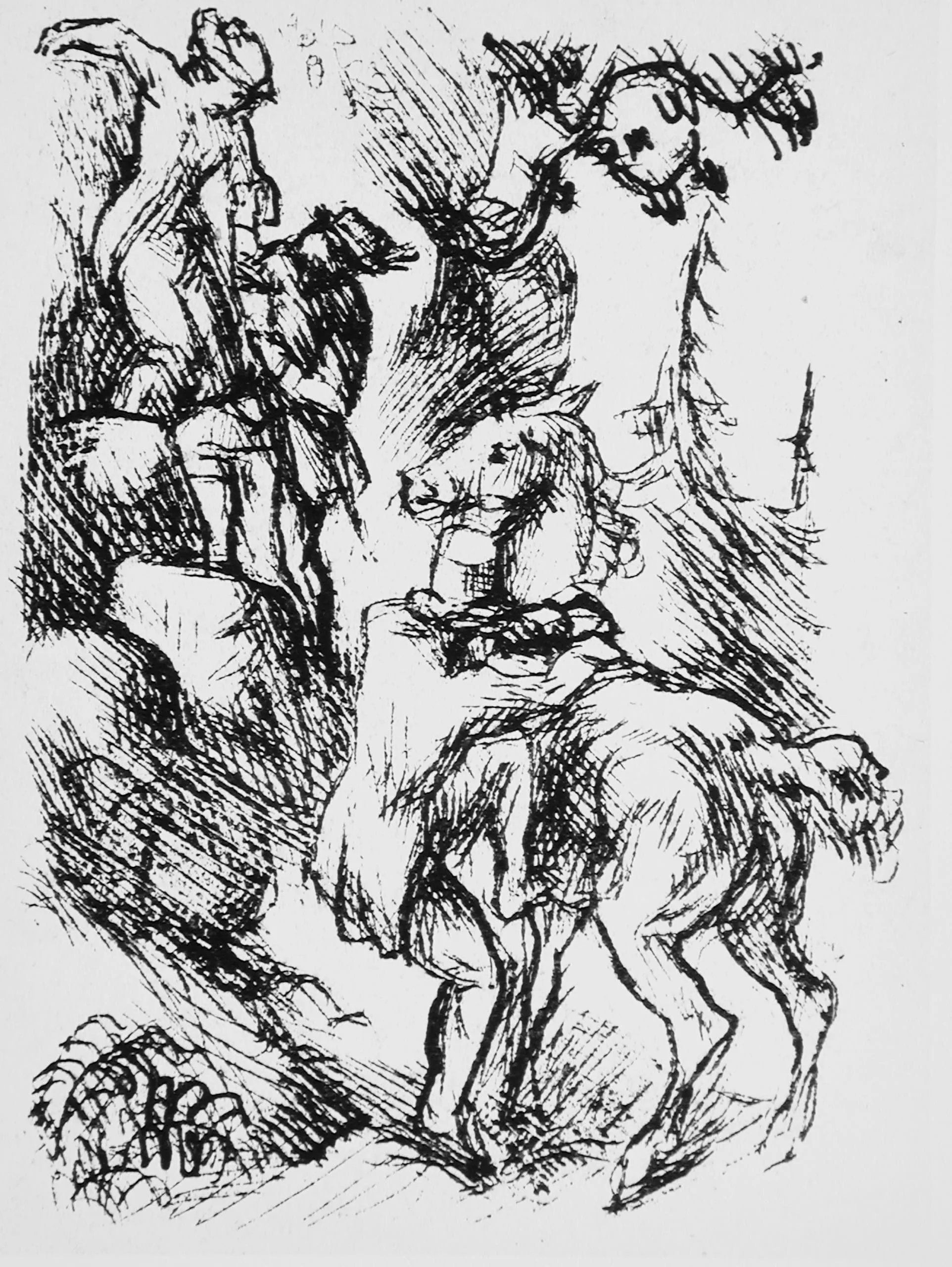Ink drawing on off-white paper, three loosely sketched riders on horseback amid dense cross-hatching suggesting trees and rocky terrain
