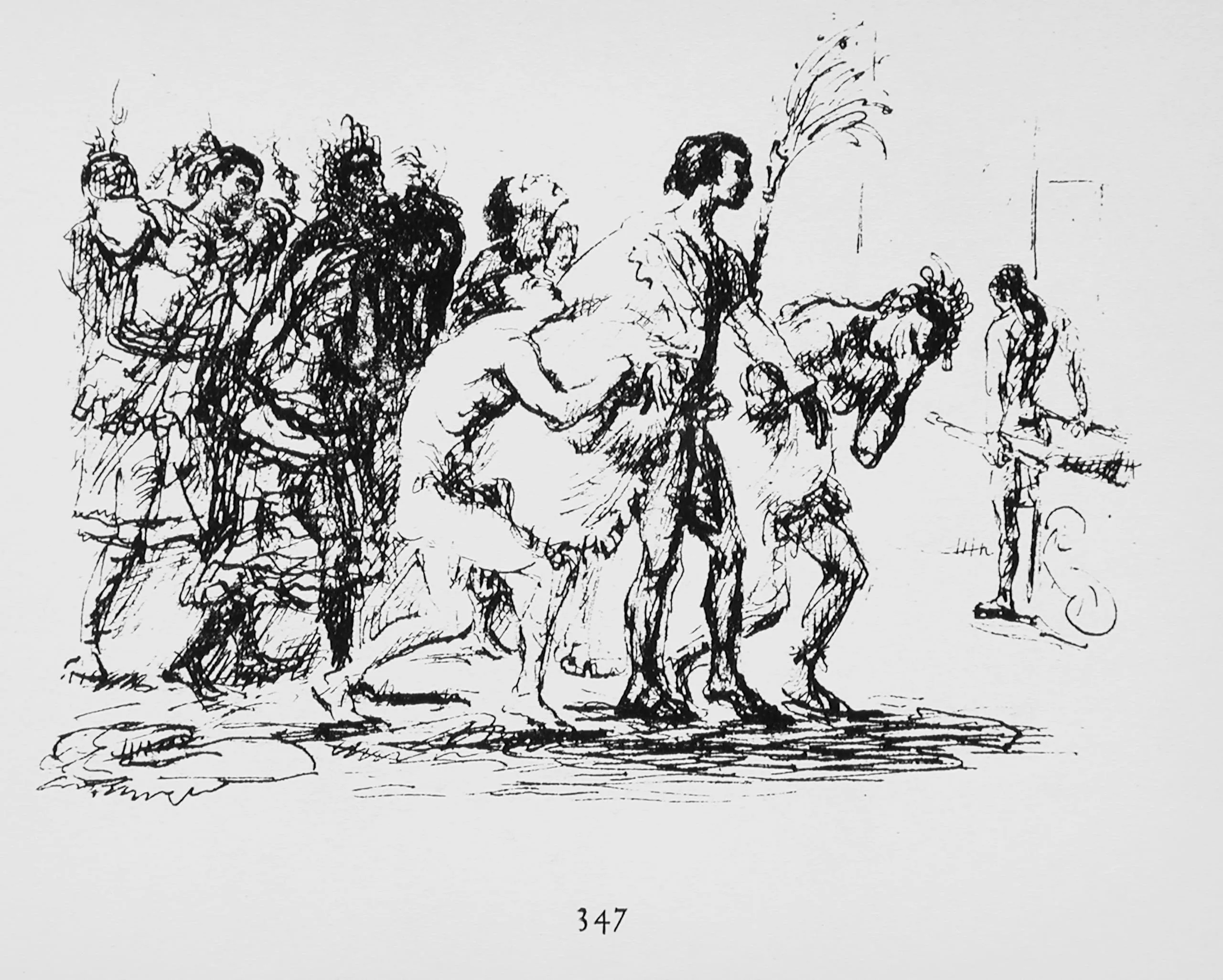 Print with loose black ink lines on cream paper, depicting a crowd of figures in motion, one carrying another, with a torch-bearer nearby