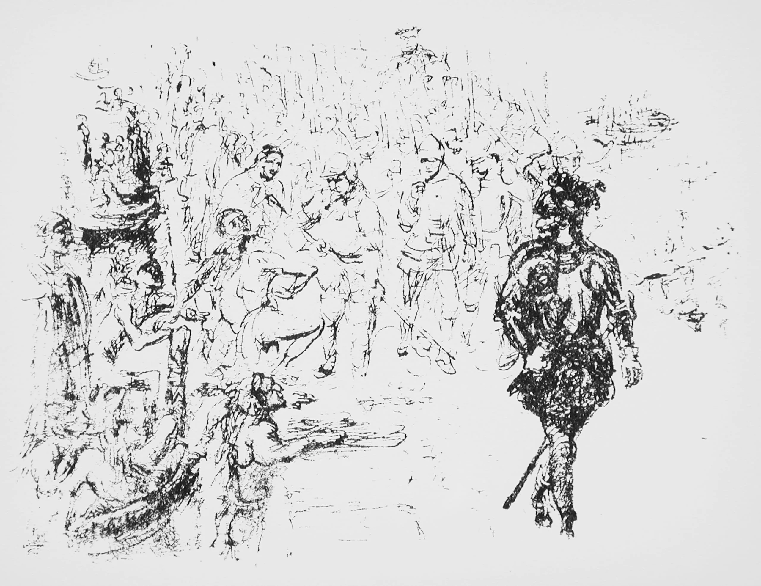 Lithograph with gestural black ink marks depicting a crowd of loosely sketched figures to the left and a single heavily inked, armored figure standing apart to the right