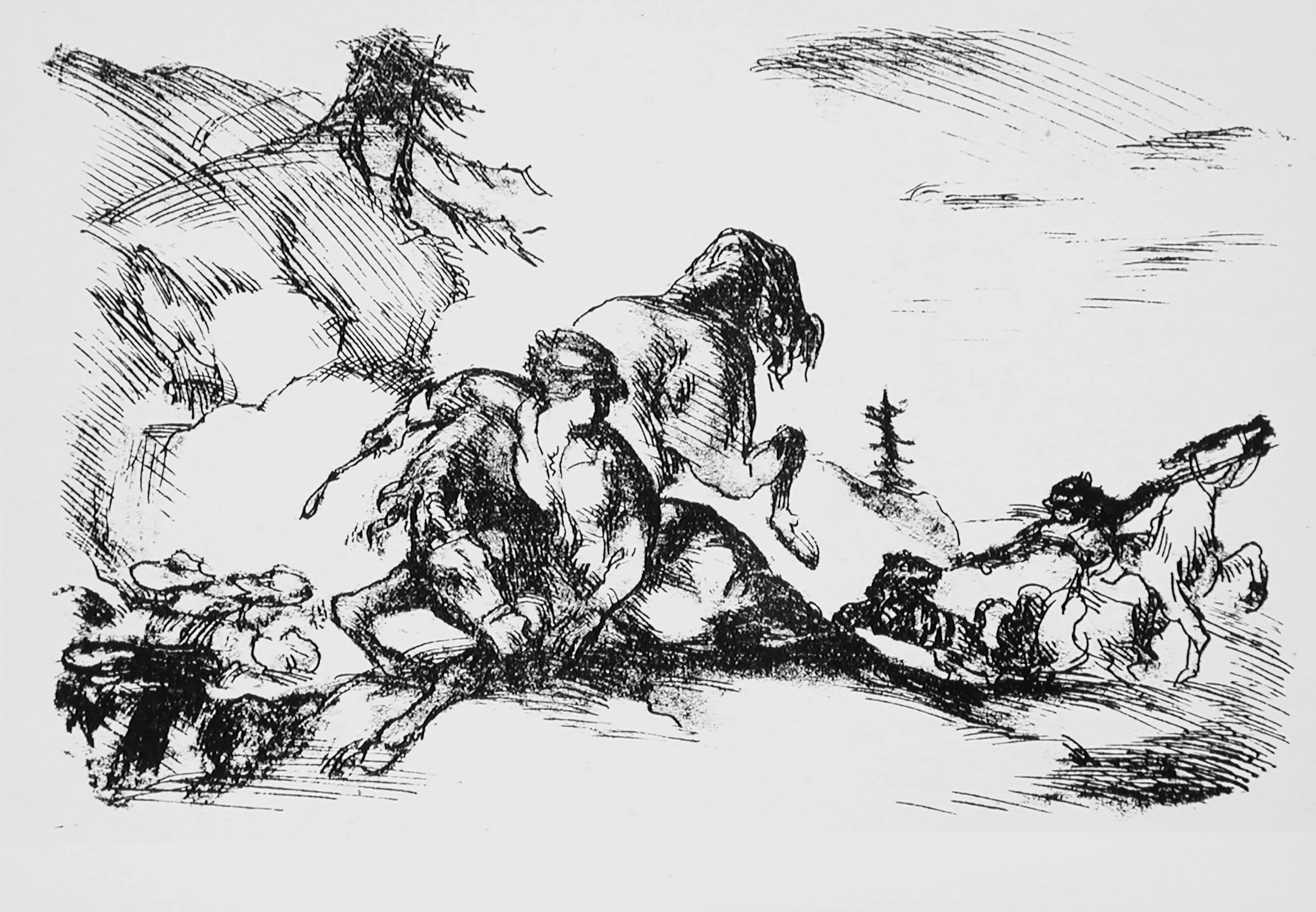 Etching or lithograph depicting tangled human and horse figures in violent motion, rendered in bold black lines with cross-hatching on pale gray paper