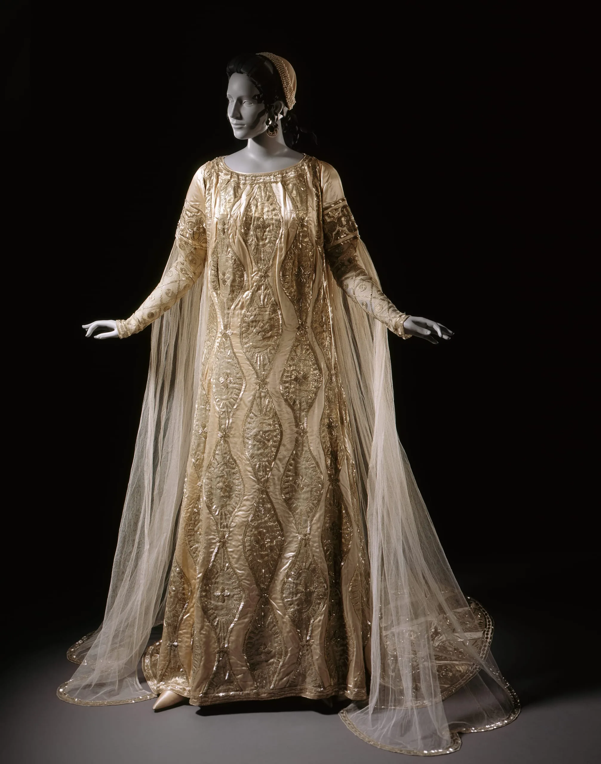- Silk satin, metallic thread plain weave (lamé), silk net, and silk plain weave (crepe chiffon) with silk- and metallic-thread embroidery and glass beads