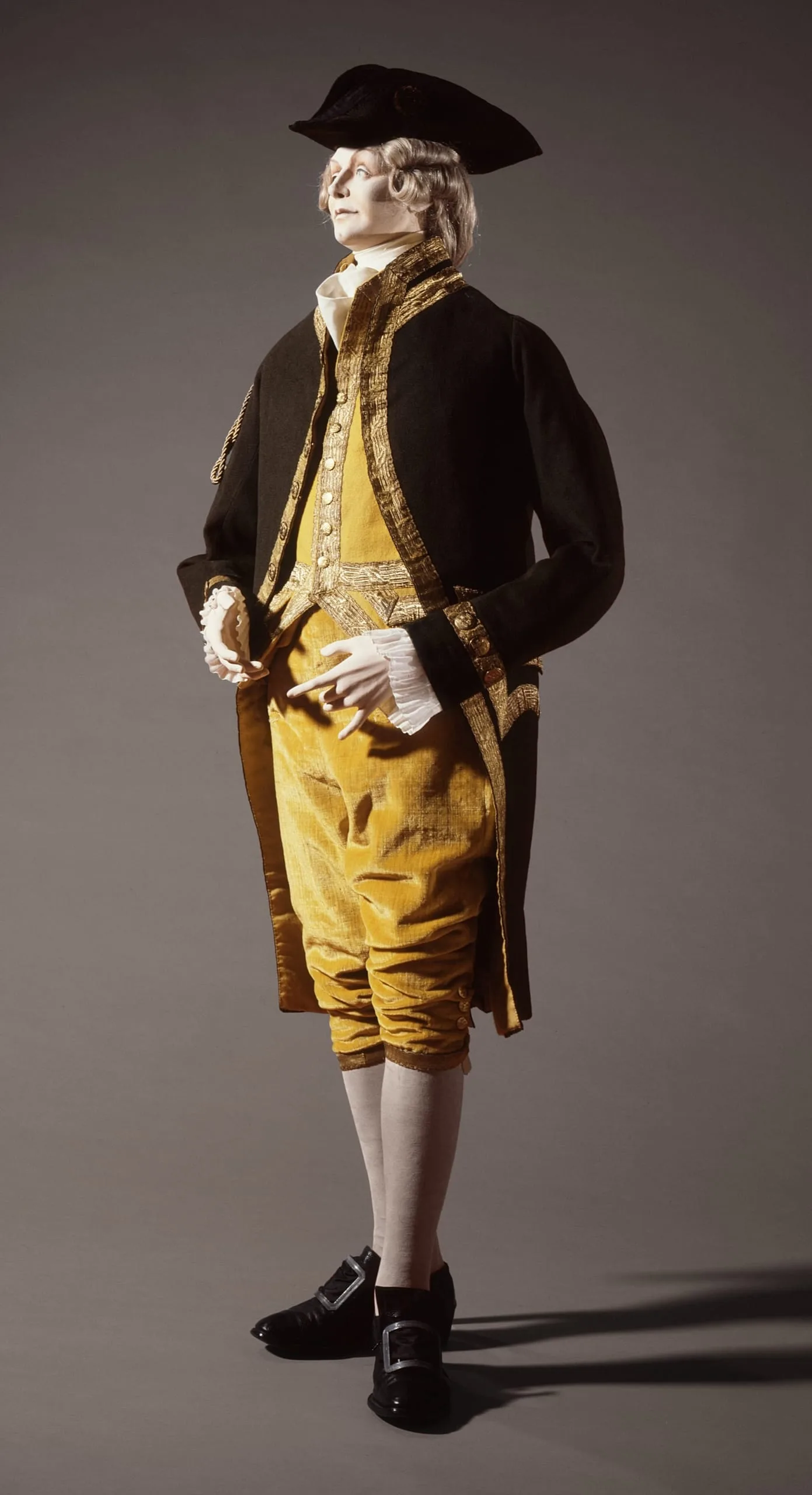 - Coat: wool plain weave, fulled, with metallic ribbon, metal braid, and metal buttons; Waistcoat: wool plain weave, fulled, with metallic ribbon and metal buttons; Breeches: wool velvet with metallic ribbon and metal buttons