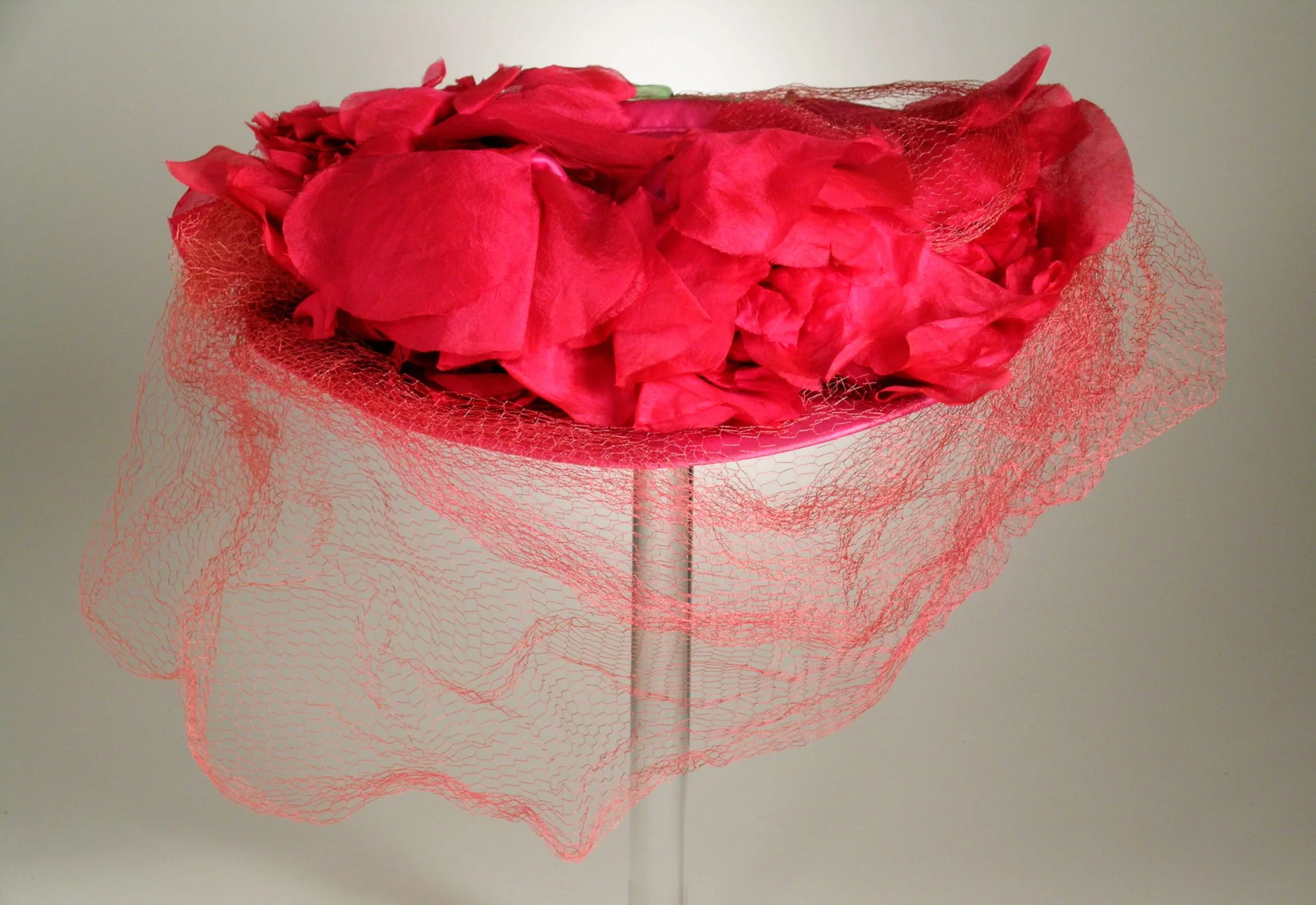 Crimson-red cocktail hat with clustered fabric flowers and a fine mesh veil with scalloped edges, displayed on a clear acrylic stand