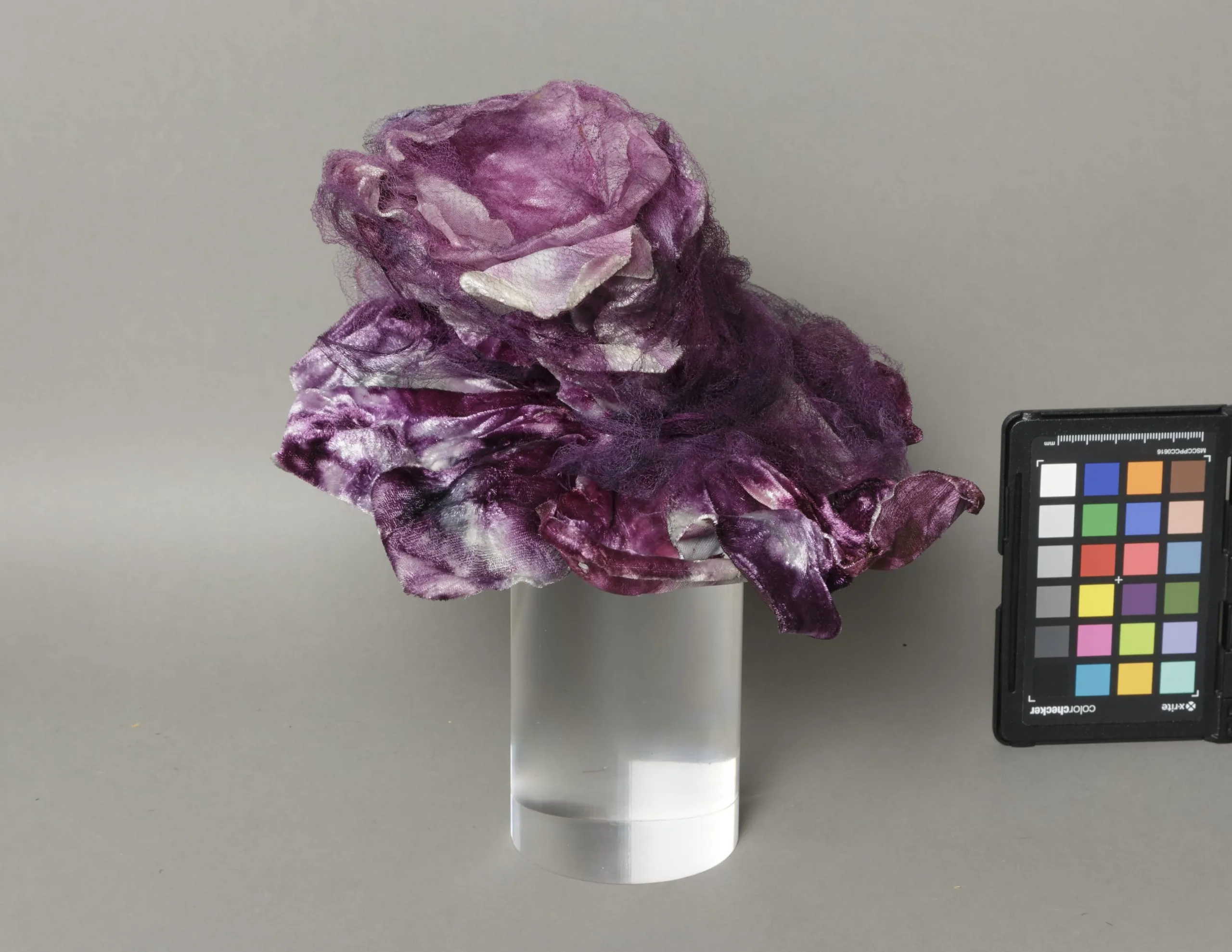 Wide-brimmed ruffle hat in variegated eggplant purple and white fabric, shaped into a large rosette at the crown, displayed on a clear acrylic stand