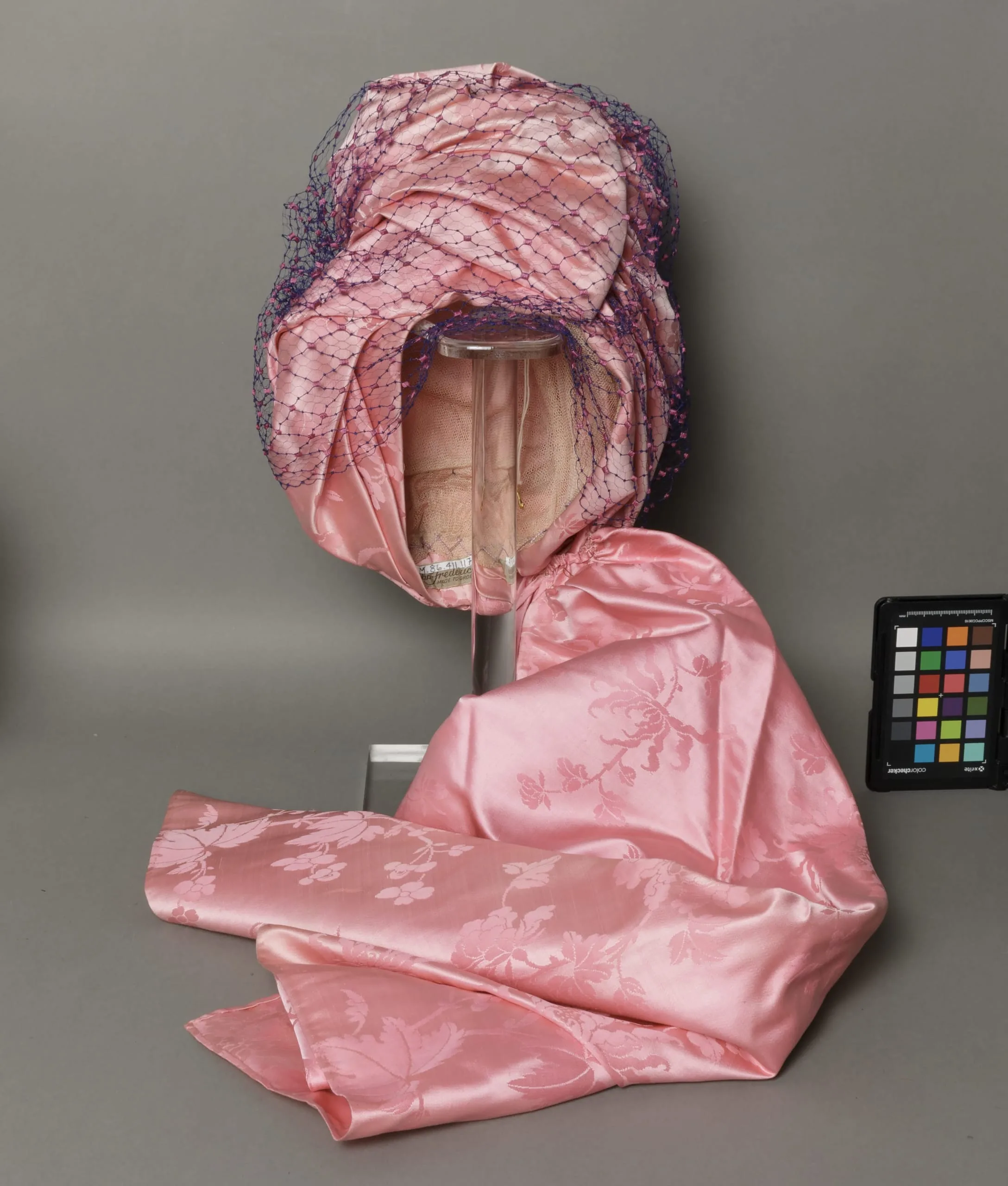 Rose-pink satin hat with violet net veil on a clear acrylic stand, with matching pink damask fabric pooled below, showing large woven floral motifs