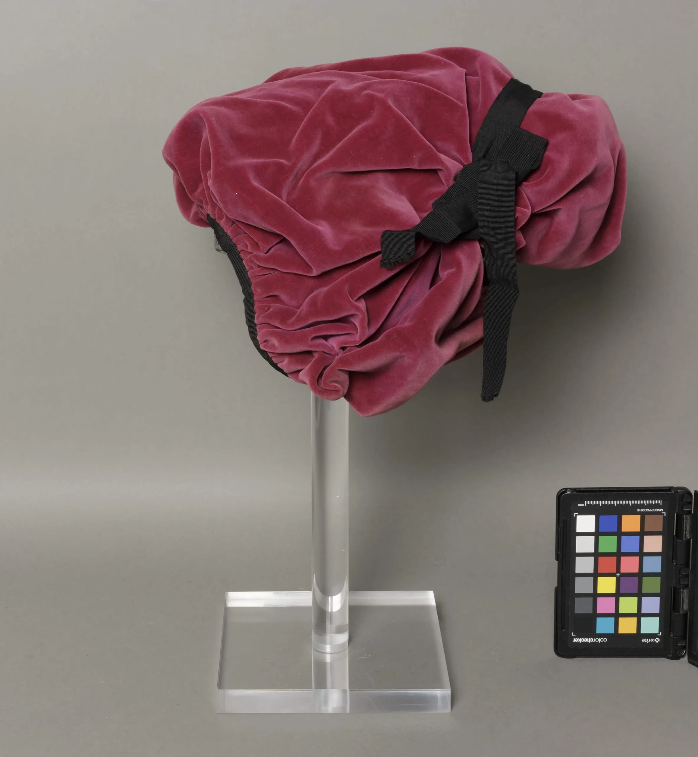 Dusty rose velvet bonnet with heavily gathered crown and black ribbon bow, displayed on a clear acrylic pedestal stand against a gray background